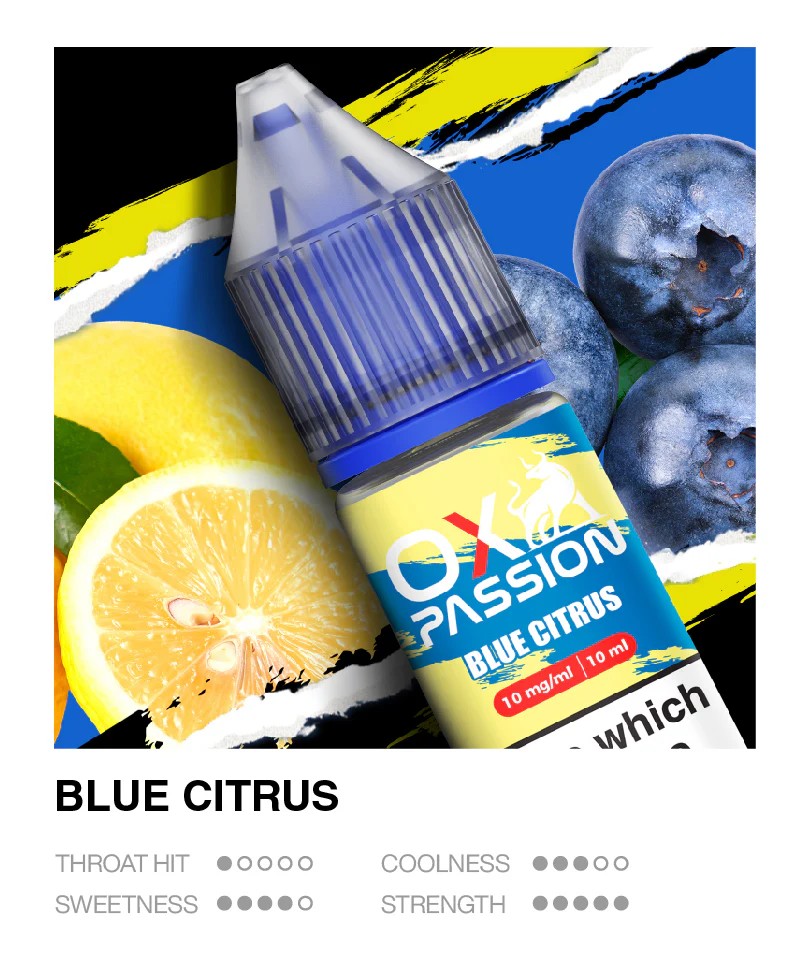 Ox Passion Blue Citrus 10ml Nic Salts. This exciting range of nic salts by Ox Passion, the sister company of the popular device maker Oxva.