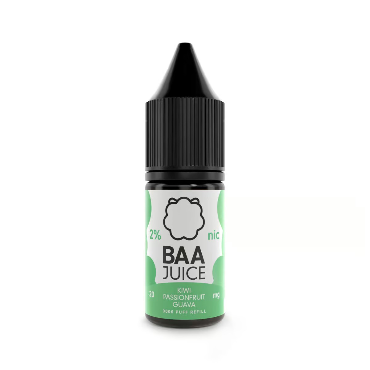 Kiwi Passionfruit Guava Baa Juice Nic Salt is available in 10ml bottles, with your choice of 10mg or 20mg nicotine strengths.