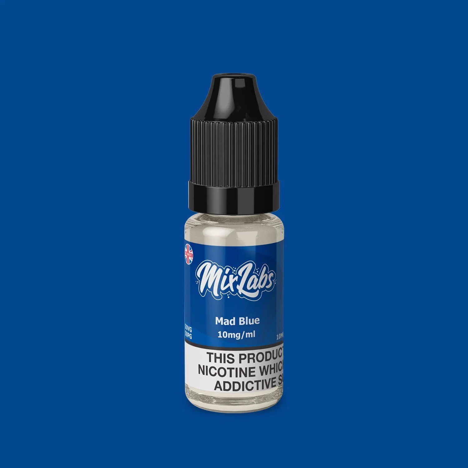Mix Labs Introduces Mad Blue nic salts, available in 10mg and 20mg nicotine strengths in 10ml bottles.