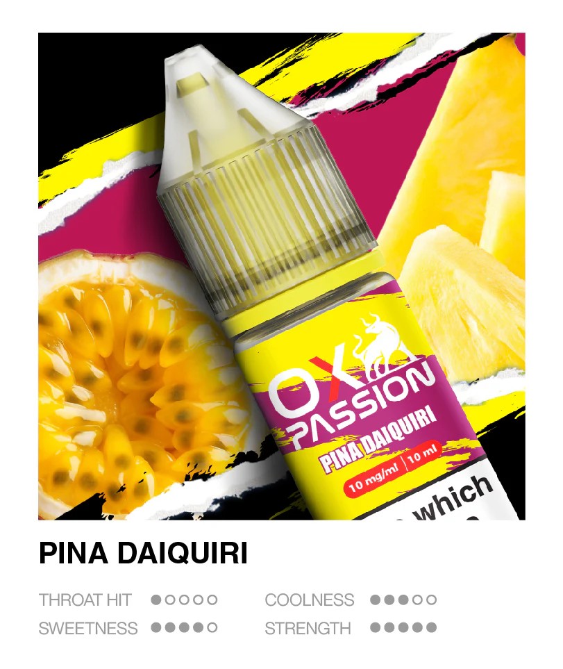 Ox Passion Pina Daiquiri 10ml Nic Salts. This exciting range of nic salts by Ox Passion, the sister company of the popular device maker Oxva.