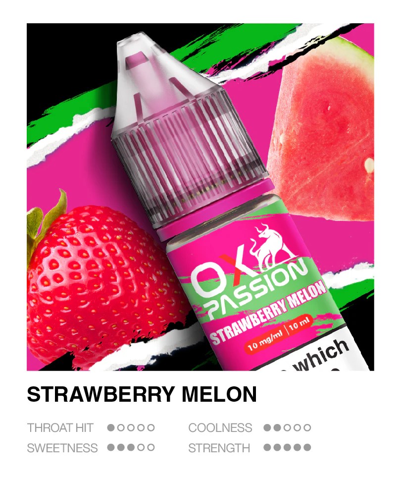 Ox Passion Strawberry Melon 10ml Nic Salts. This exciting range of nic salts by Ox Passion, the sister company of the popular device maker Oxva.