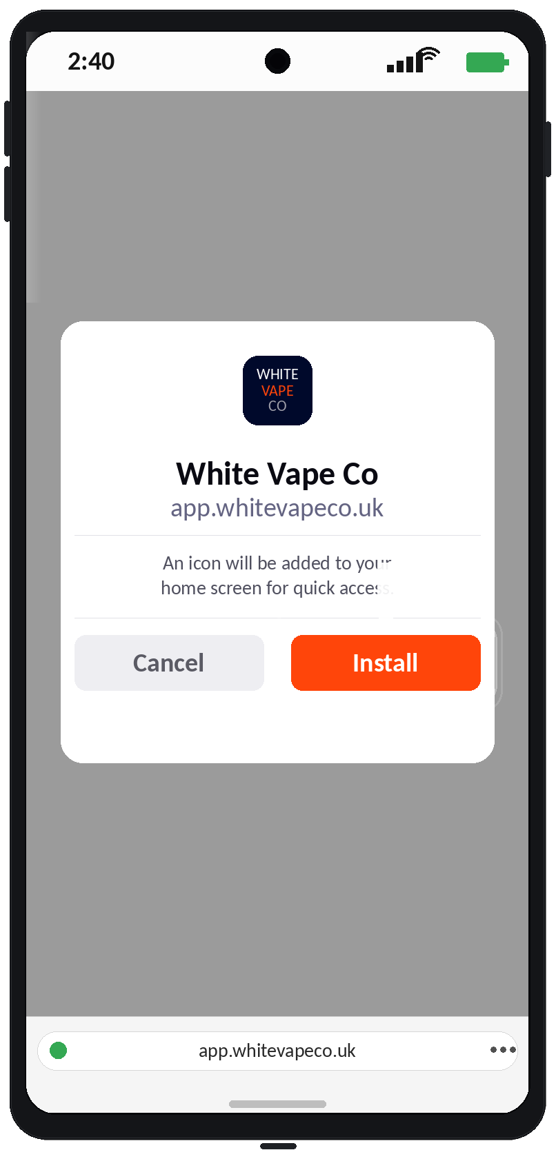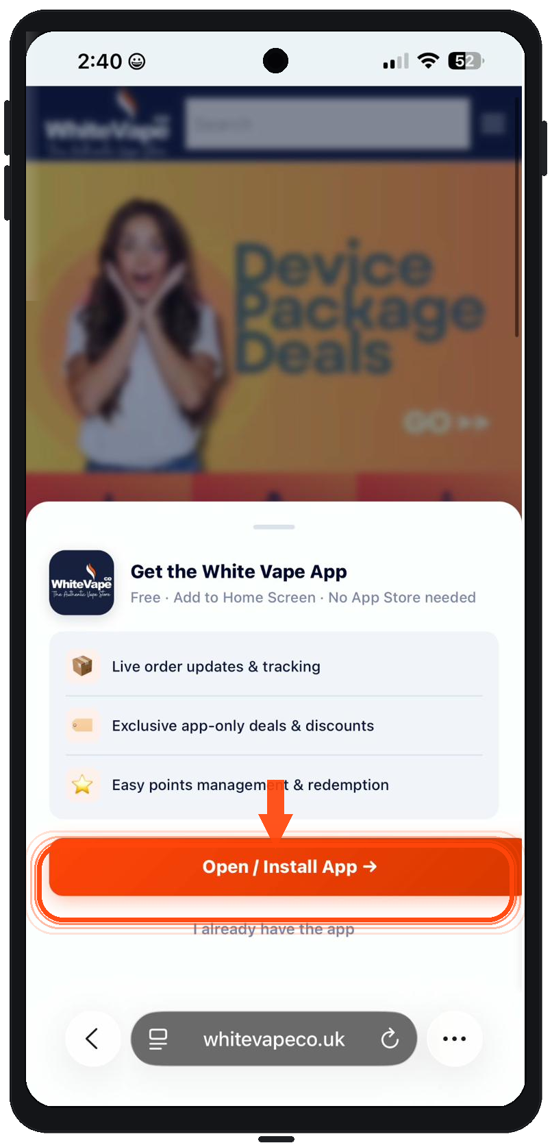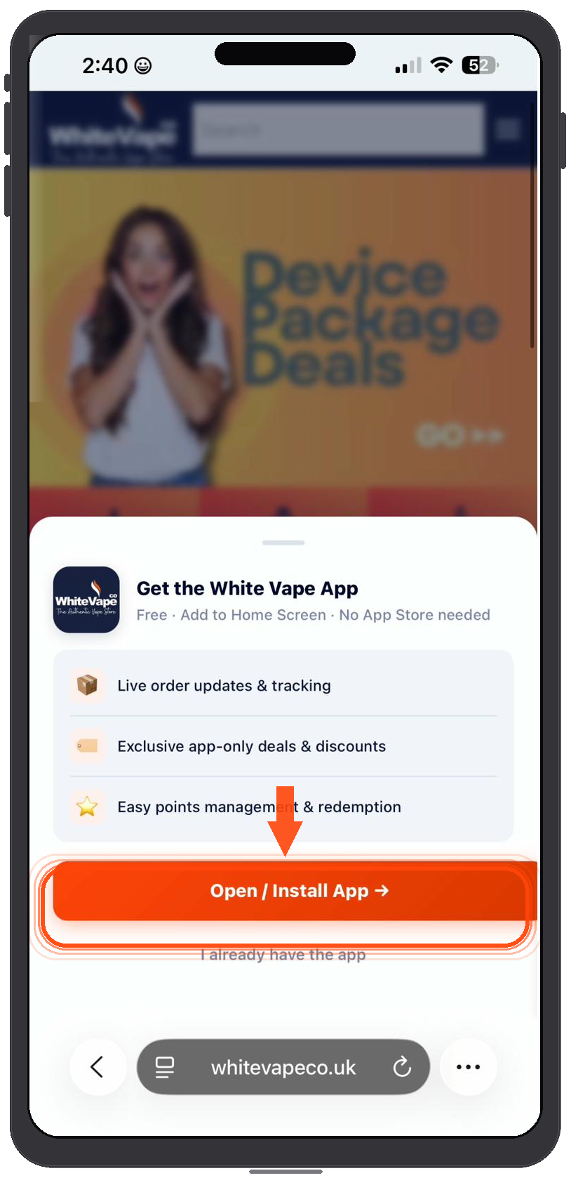 - Open your phone’s browser (Safari on iPhone, Chrome on Android) and go to app.whitevapeco.uk